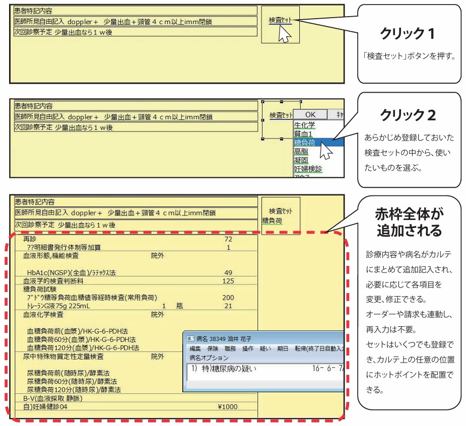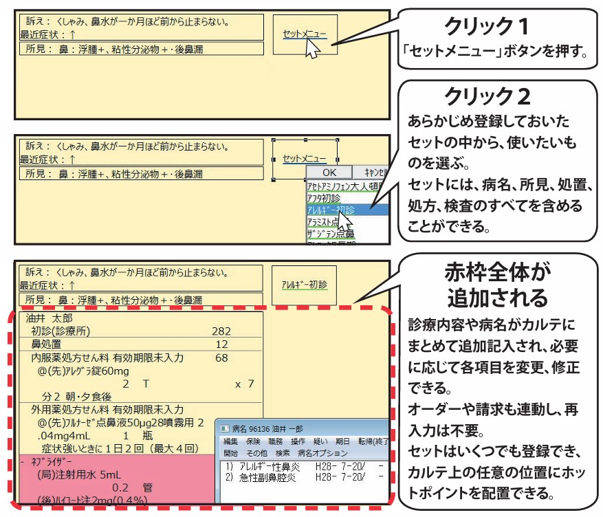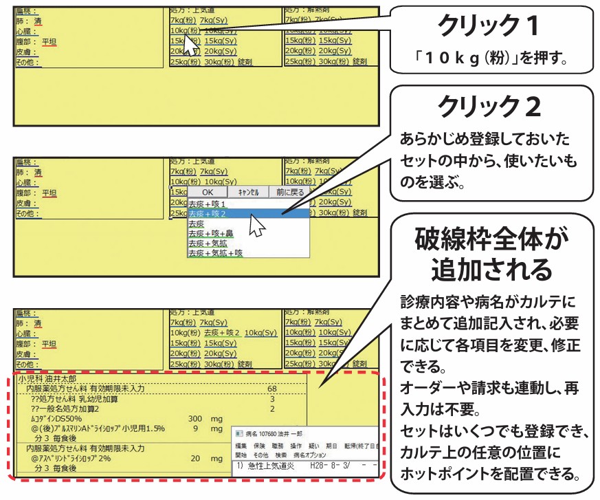 病名、所見、処置、処方、検査のすべてを2クリックでカルテに布置できるので、部位別や疾患別のセットを用意すると、必要な事項だけのスッキリしたカルテになります。