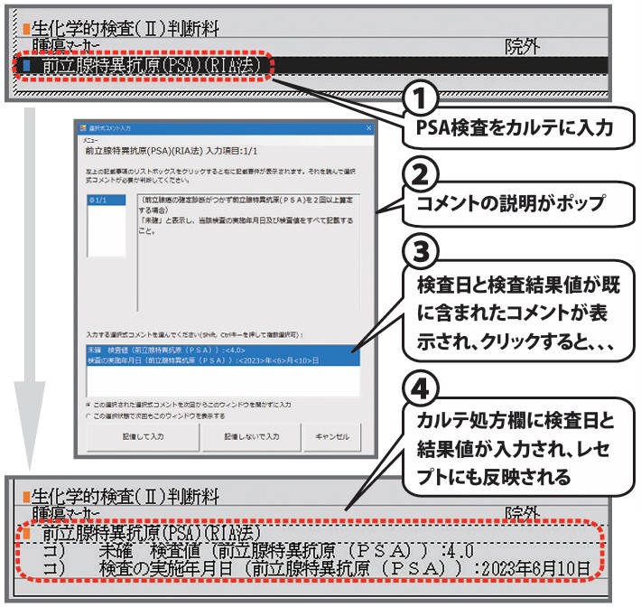 医師がPSA検査を入力すると、ドクターソフトが瞬時に検査結果を探し、複数日の結果があるときは、日付と結果値のリストを提示し、医師がリストを選択クリックするだけで厚労省規格のコメントを自動作成/入力します。そして、そのままレセに反映します。