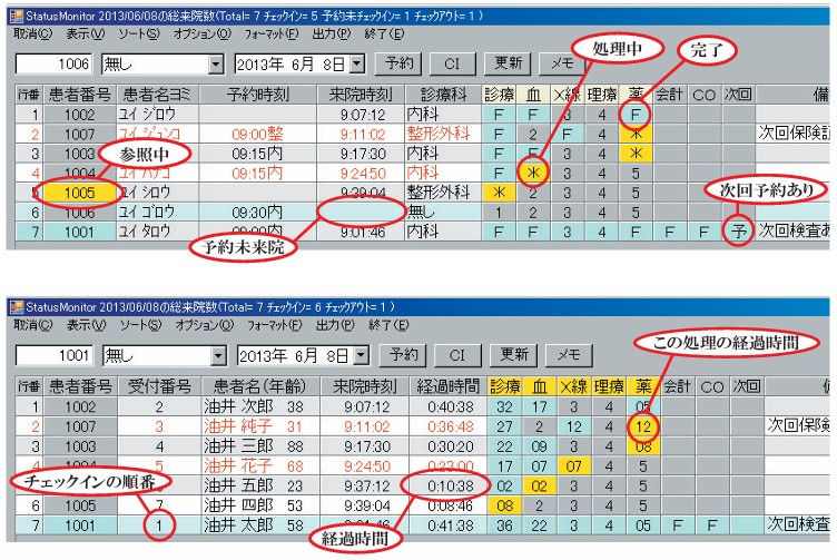 それぞれの患者がどの段階で何分待っているかも把握でき、長いと警告も表示します。