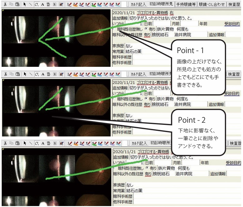 カルテ上のどこにでも手書きができます。