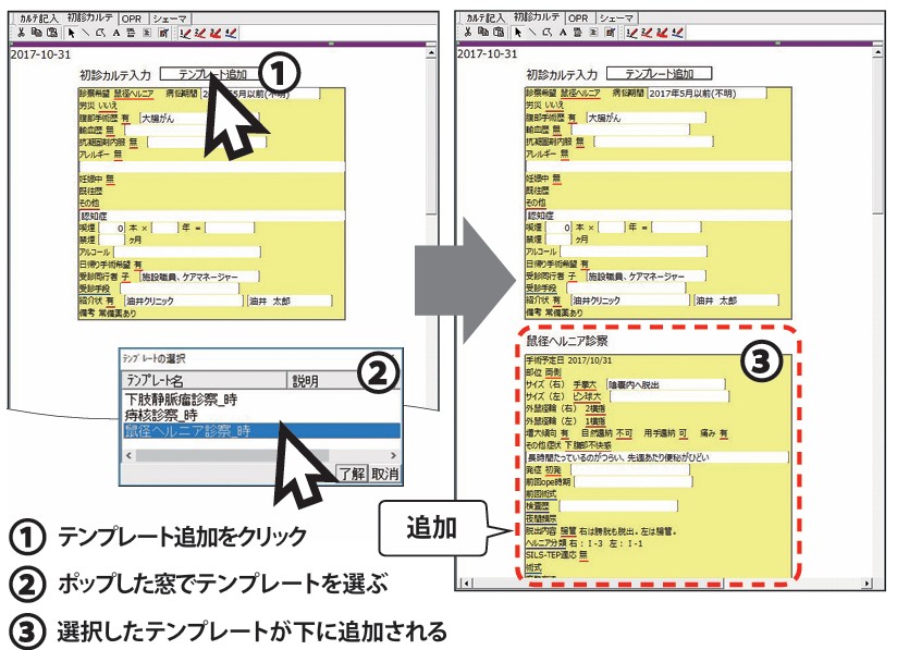 さらに、部分的なテンプレートをカルテ記述時に追加することもできます。これにより、余計な表示が無くすっきりとしたカルテになります。